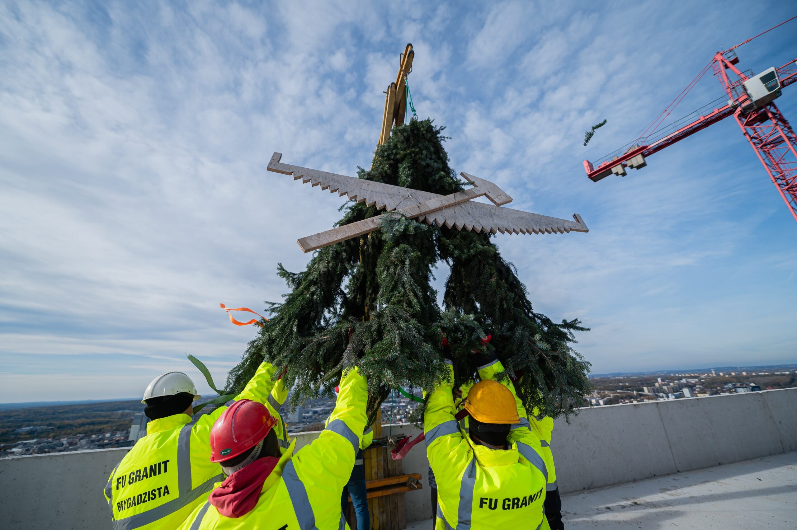wciągnięto na ostatnią kondygnację za pomocą żurawia. W ceremonii wzięli udział m.in. Zbigniew