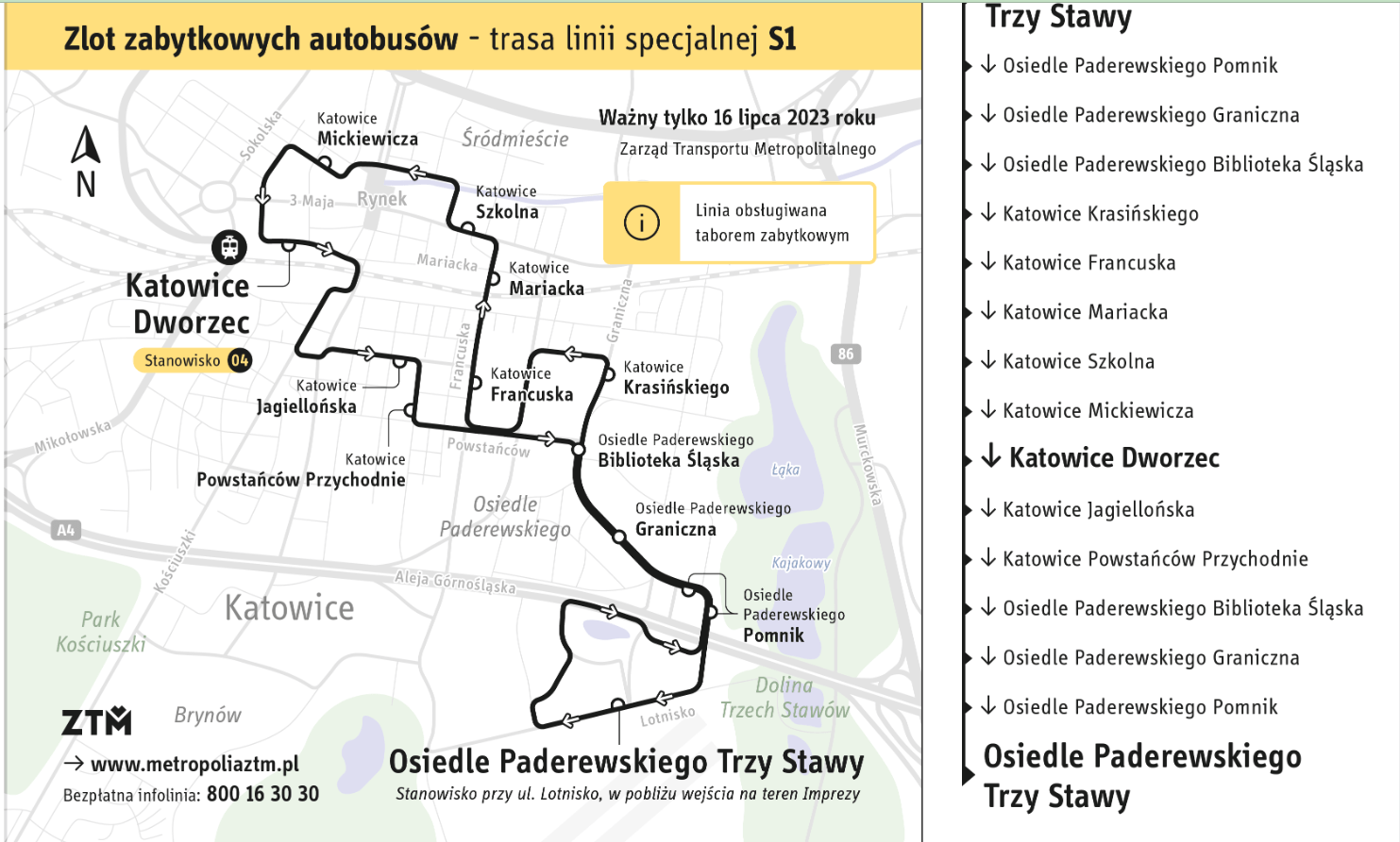 Przez cały dzień na trasie Katowice Mickiewicza – Katowice os. Paderewskiego Trzy Stawy będzie kursowała również linia specjalna obsługiwana autobusami zabytkowymi Ikarus. Będzie to linia oznaczona S1. I pierwsza taka linia „ikarusowa” w naszym regionie od czasu zjazdu tych autobusów z linii w 2016 roku. Pierwszy kurs będzie o godz.10:43, a ostatni kurs zjazdowy zamelduje się na przystanku Katowice Dworzec o godzinie 19:31. Przejazdy są bezpłatne.