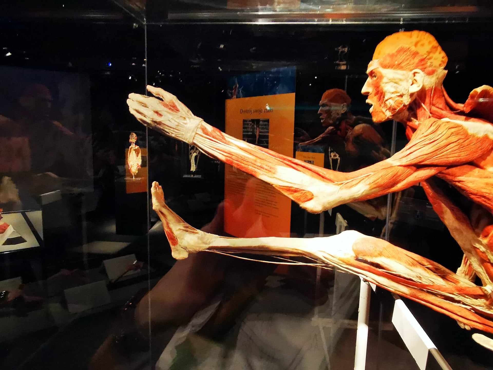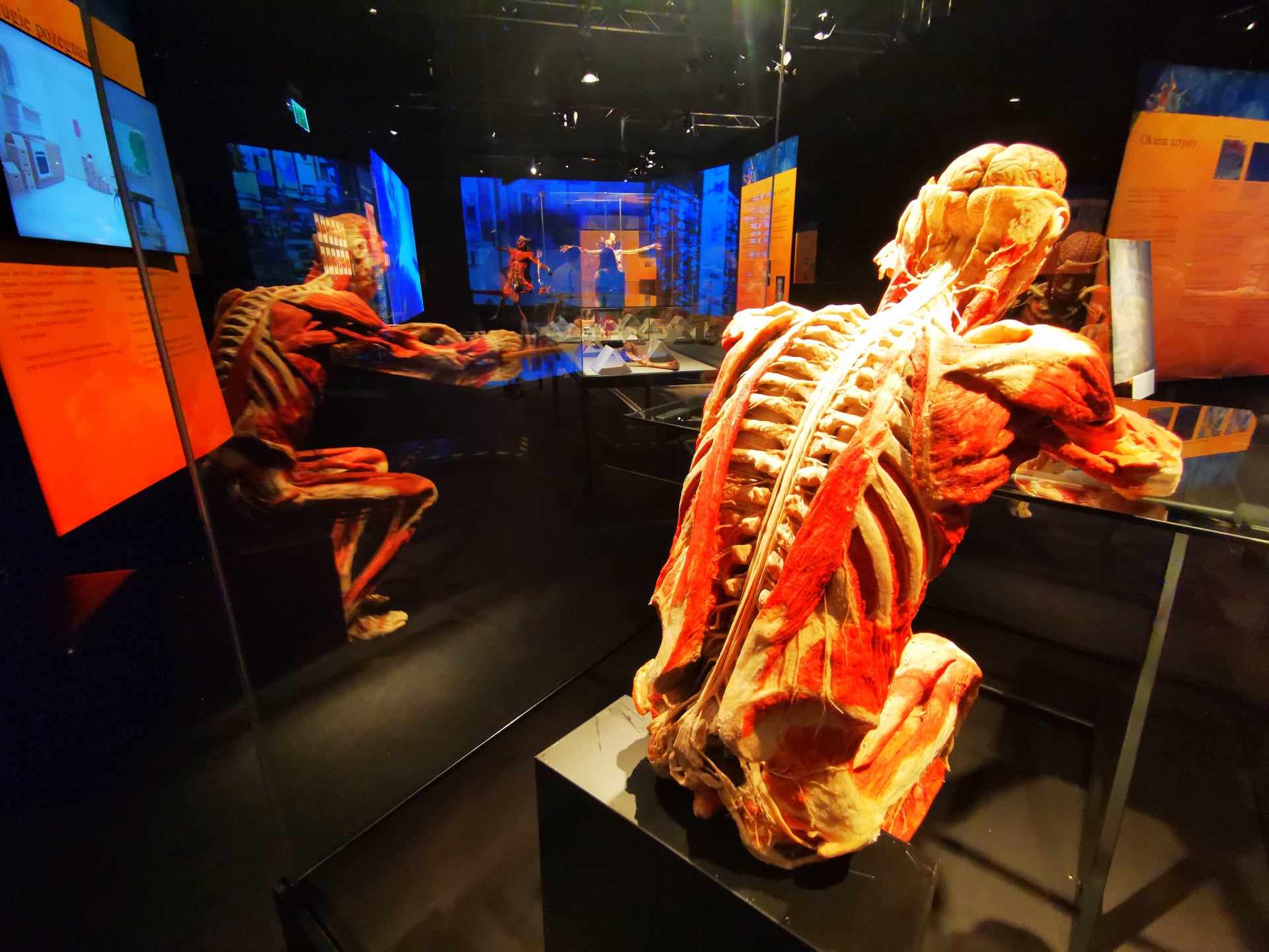 Na wystawie jest nie tylko kilkanaście spreparowanych ciał naturalnych rozmiarów, ale też ponad setka fragmentów – organów, kości, zarodków. Pamiętajcie o tym, kiedy pójdziecie ją zobaczyć z dziećmi. Są tu np. genitalia i płoty w różnych fazach rozwoju. Są też np. czarne płuca palacza, płuca czy pierś ze zmianami nowotworowymi, ślady po złamaniach na kości. Jednak nie ma ograniczeń wiekowych. Zresztą, liczną grupą gości są szkolne wycieczki. Każdy eksponat jest opisany i oznaczony. Jest też grupa ekspertów od anatomii, którzy chętnie i wyczerpująco opowiadają, co widać na eksponacie.