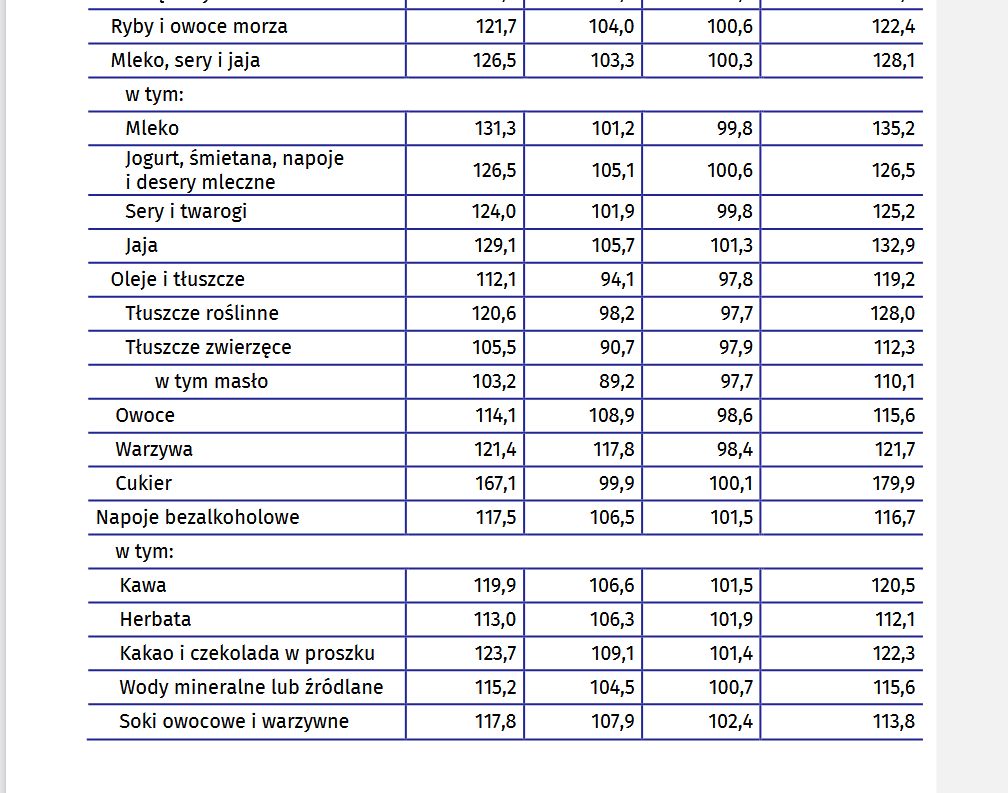 Zobaczcie tabelę, jaką przygotował GUS. To dane, o ile podrożały takie produkty i usługi jak nabiał, masło czy mleko. A także ryby, mięso, wizyty u lekarza czy wyjście do kina lub wyjazd do sanatorium. Oraz gaz czy energia elektryczna – bo ich ceny przyprawiają o siwe włosy. Podrożały też pieczywo, kawa, cukier czy alkohol, i to sporo!
