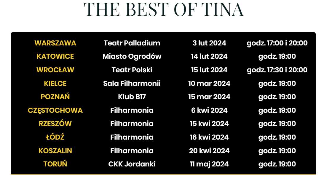 To będzie cała trasa koncertowa, która zacznie się 3 lutego w Warszawie, a zakończy w maju w Toruniu. Potem będą Katowice, a następnie m.in. Poznań, Kielce, Częstochowa. Jak informują organizatorzy, w Katowicach w sali instytucji Katowice Miasto Ogrodów koncert odbędzie się 14 lutego 2024 o godzinie 19:00. The Best of Tina, będący hołdem dla legendarnej artystki Tiny Turner. – To okazja, by dać ponieść się zabawie, dzieląc te chwile z bliskimi, czy obdarowując ich z okazji Walentynek pięknym, muzycznym prezentem.