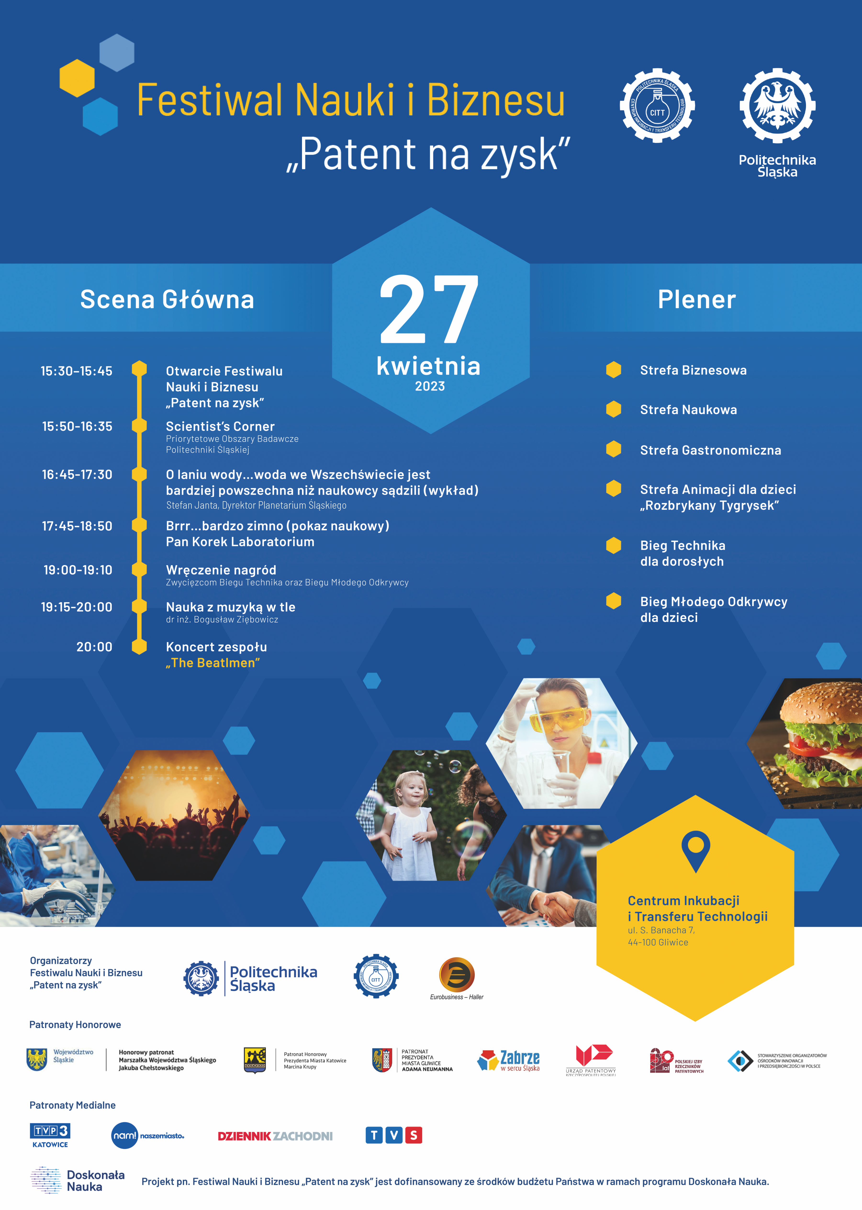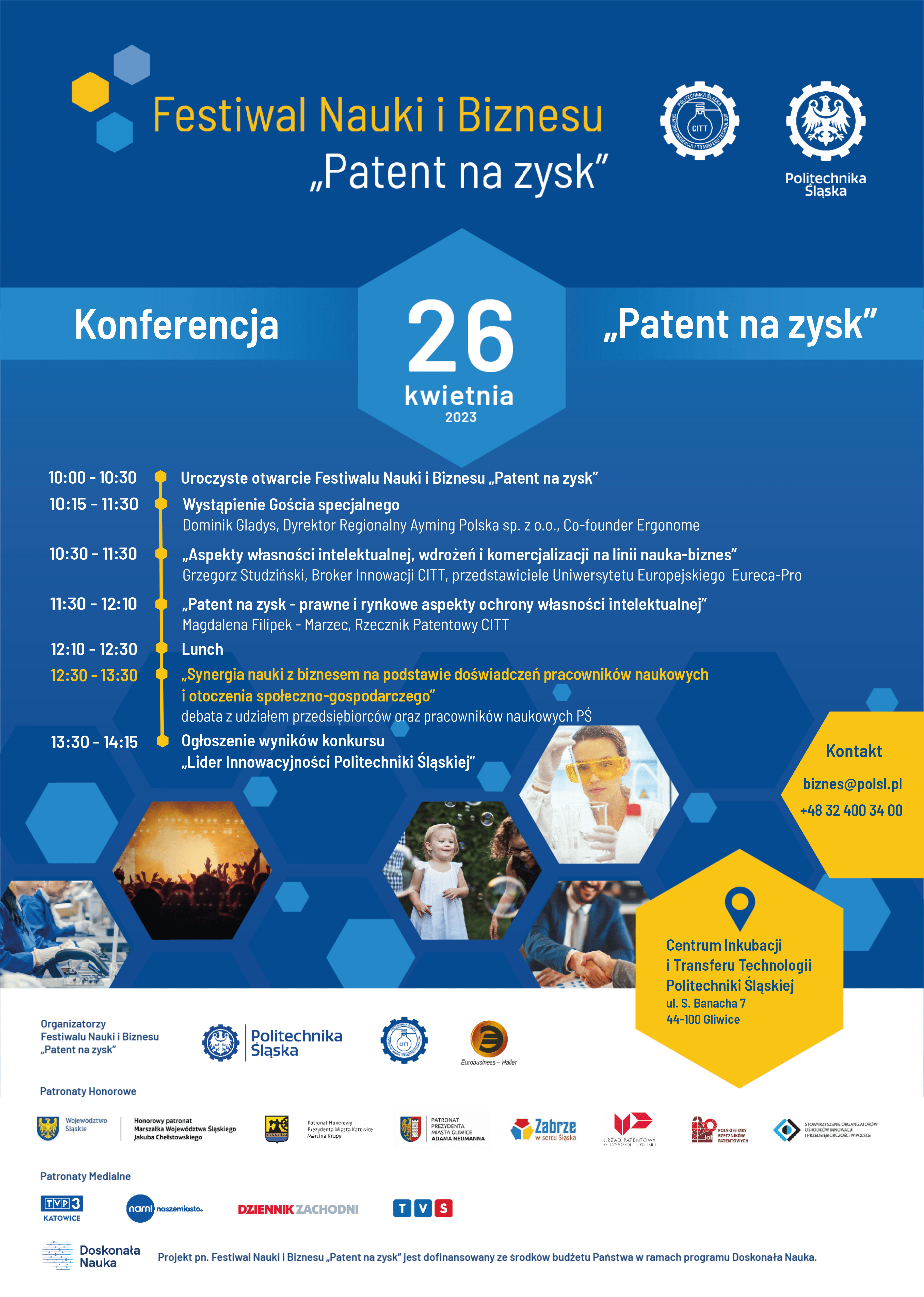 W dniach 26-27 kwietnia 2023 r. w ramach obchodów Światowego Dnia Własności Intelektualnej, Centrum Inkubacji i Transferu Technologii Politechniki Śląskiej organizuje wydarzenie pn. Festiwal Nauki i Biznesu „Patent na zysk”, które jest dofinansowane ze środków budżetu Państwa w ramach programu Doskonała Nauka.