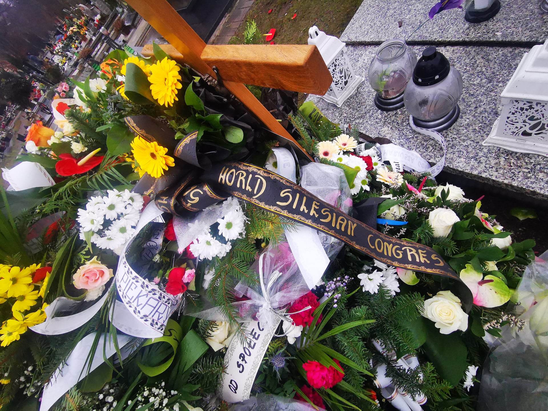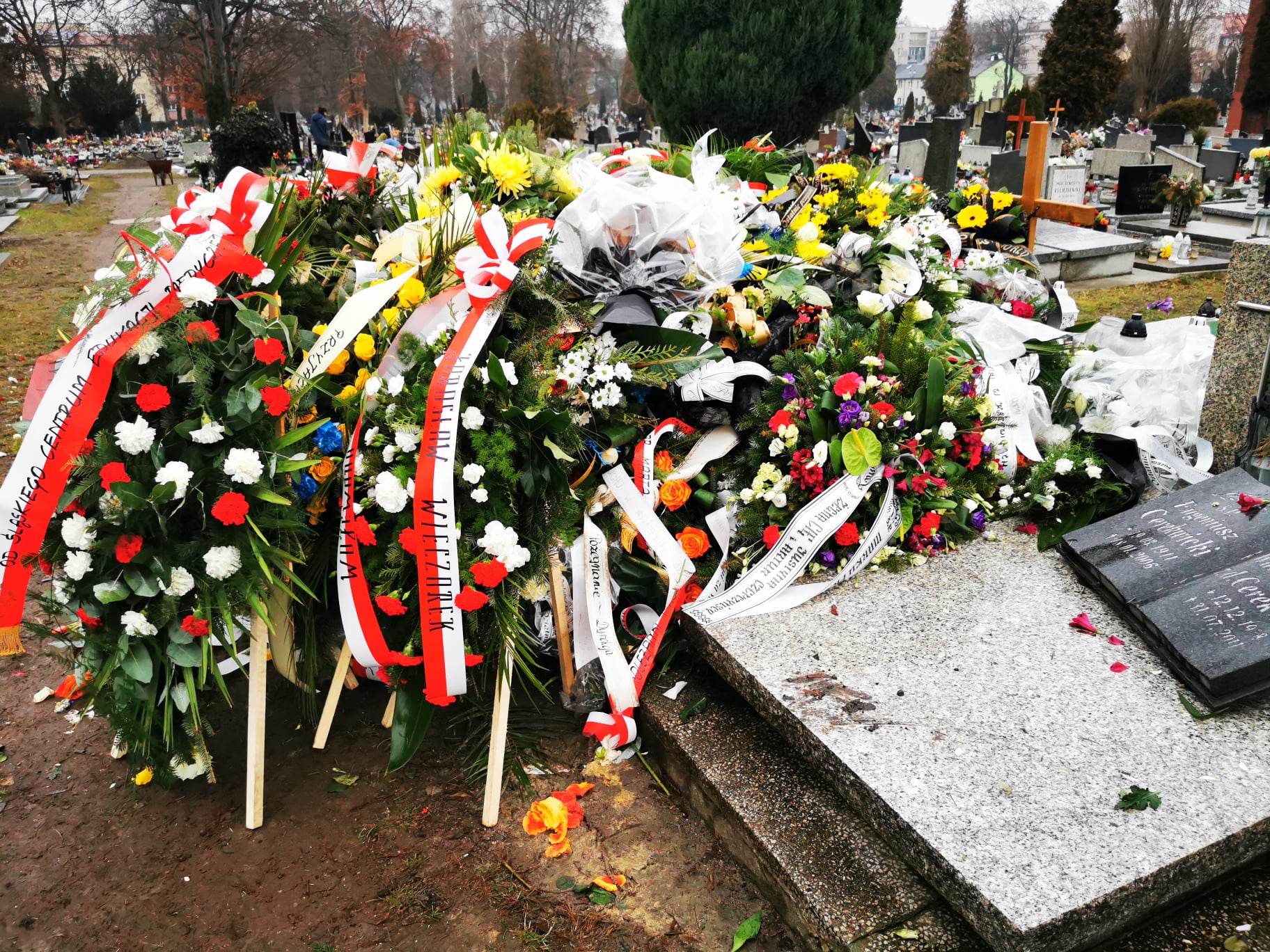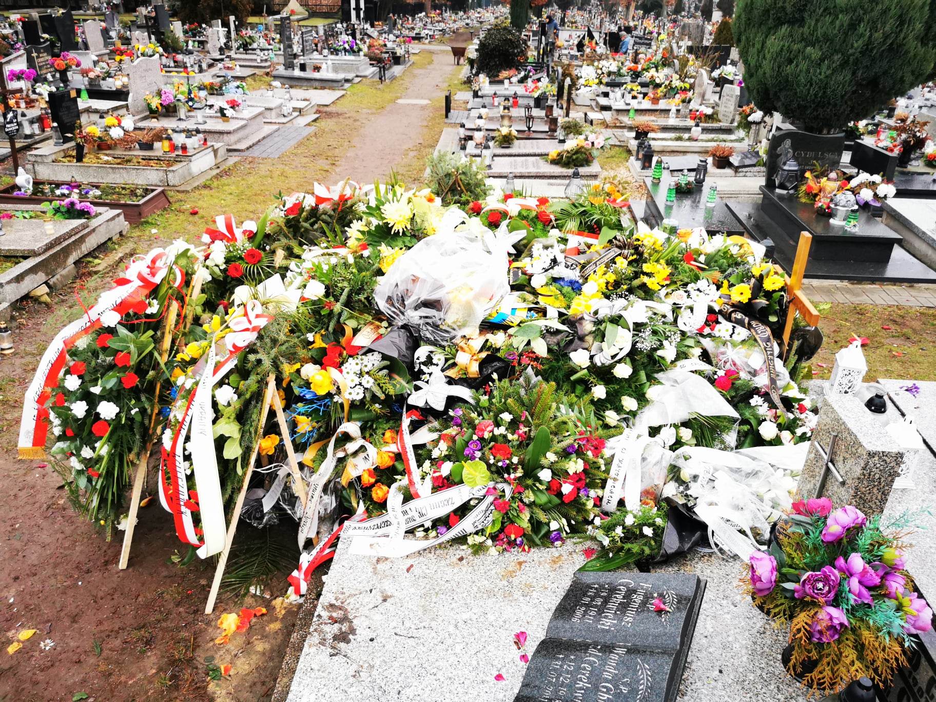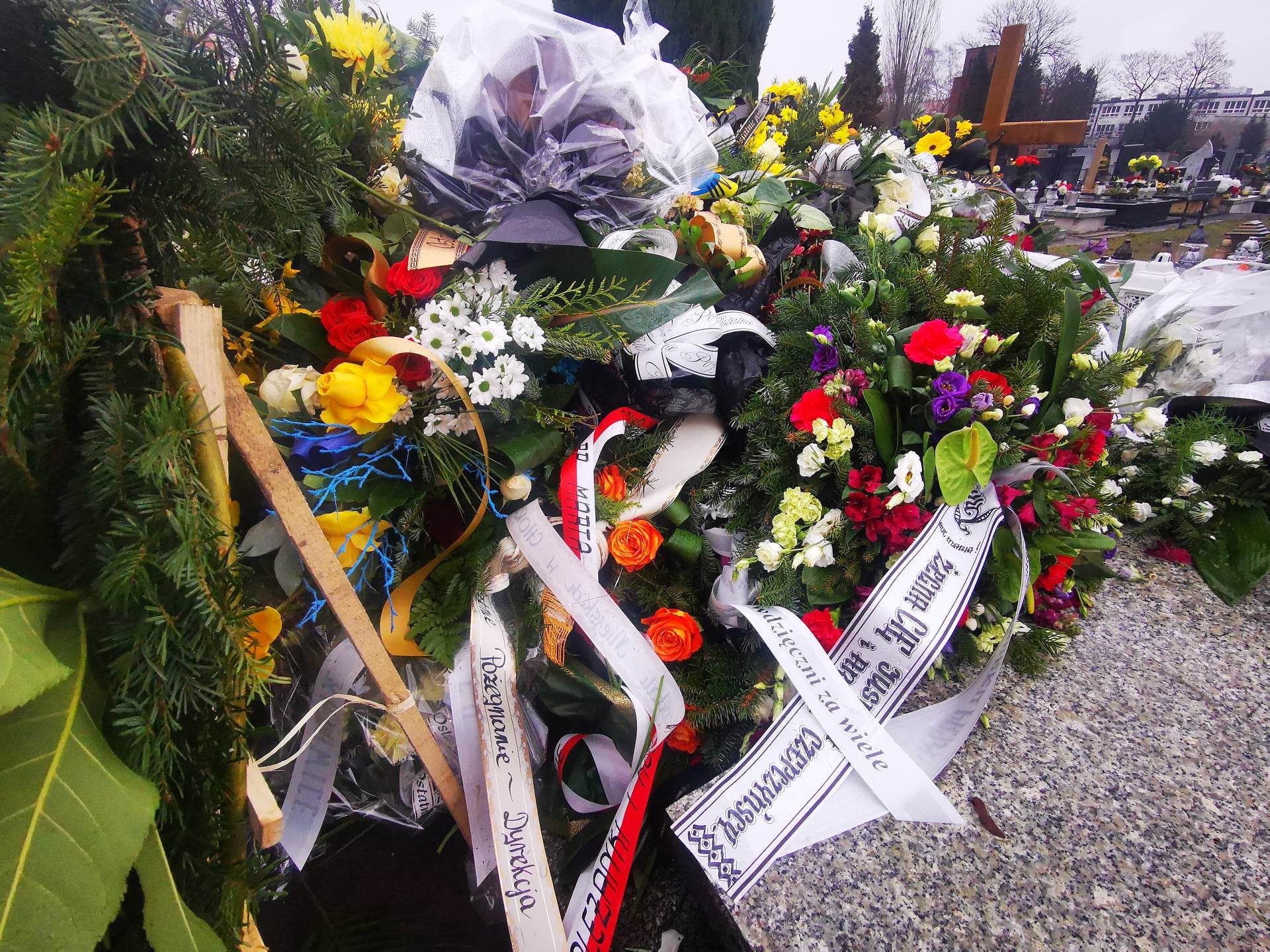 Czegoś takiego na cmentarzu przy Sienkiewicza jeszcze nie widzieli. Grób senatora Marka Plury tonie w kwiatach. W zasadzie – wcale nie widać grobu. Widać ogromny kopiec wieńców i wiązanek. Nie ma wątpliwości: śmierć tego wielkiego i skromnego Ślązaka poruszyła region i kraj, niezależnie od opcji politycznych. Są tu piękne wieńce od rodziny i instytucji, są wiązanki od przyjaciół, polityków, stowarzyszeń, ludzi, którym Marek Plura pomógł. Są białe i czerwone róże, anturium, wiązanki żółto-niebieskie, wzruszająca pojedyncza czerwona róża. Zobaczcie na zdjęciach na końcu tekstu morze kwiatów na grobie Marka Plury. Tak to wygląda w całości.