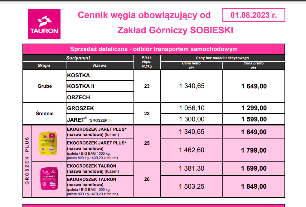 - Groszek (Sobieski) kl. 23 – 1299 zł tona brutto bez akcyzy