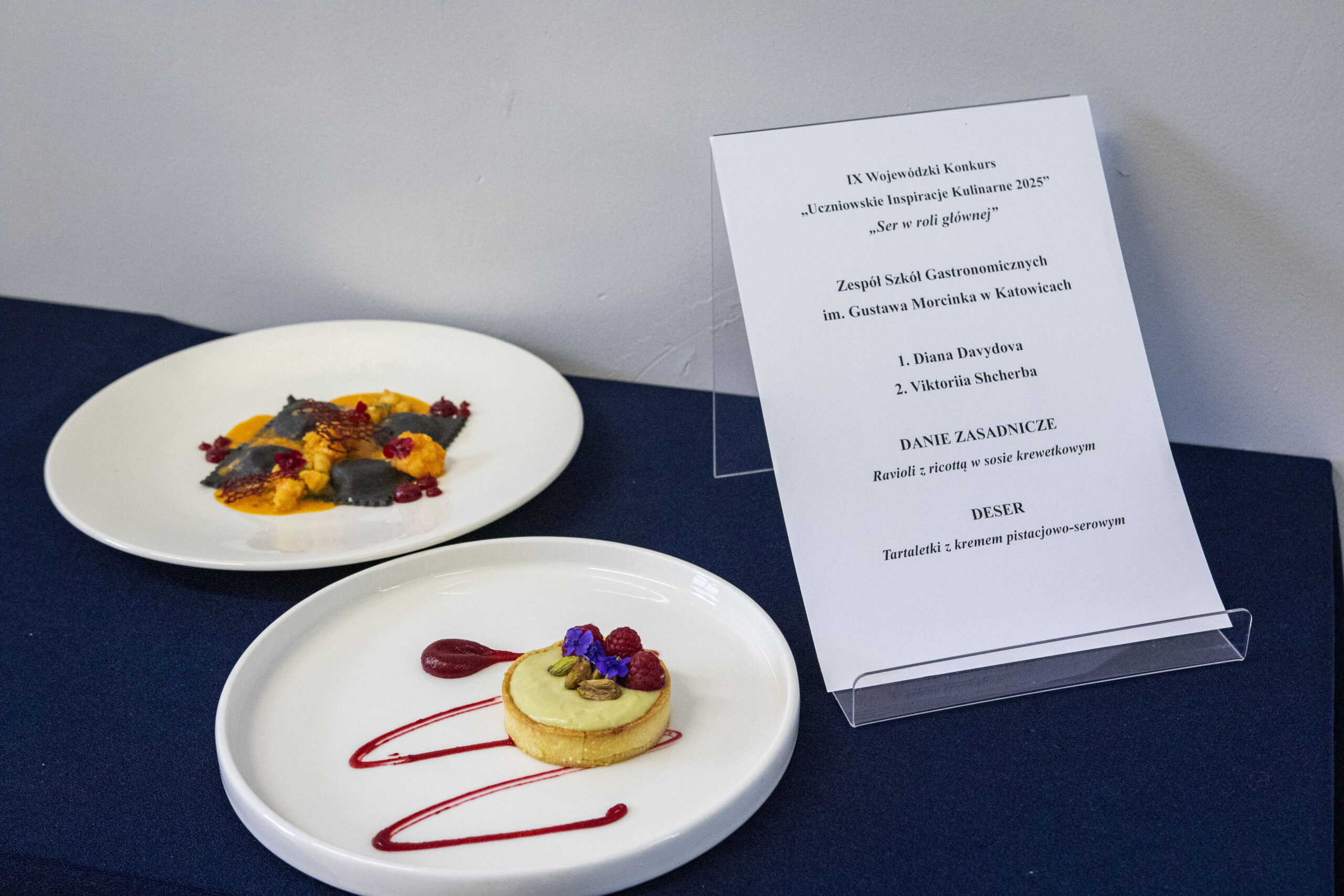🥈 II miejsce: Diana Davydova i Viktoriia Shcherba (Zespół Szkół Gastronomicznych im. Gustawa Morcinka w Katowicach) – zaprezentowały ravioli z ricottą w sosie krewetkowym oraz tartaletki z kremem pistacjowo-serowym.