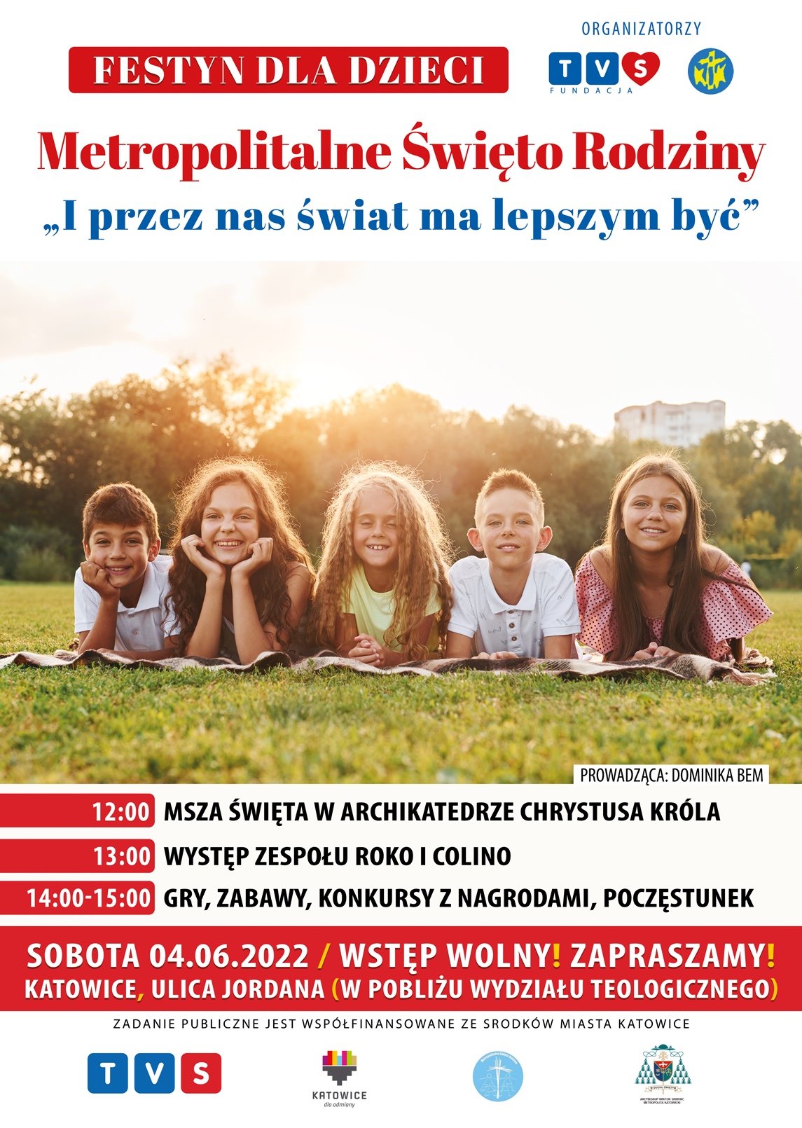 Fundacja TVS pragnie zaprosić wszystkie dzieci wraz z opiekunami na niezwykły festyn z okazji Dnia Dziecka pod hasłem „I przez nas ma świat lepszym być”. Organizowana w ramach Metropolitalnego Święta Rodziny impreza odbędzie się w sobotę 4 czerwca 2022 roku na placu przy ulicy Jordana w Katowicach.