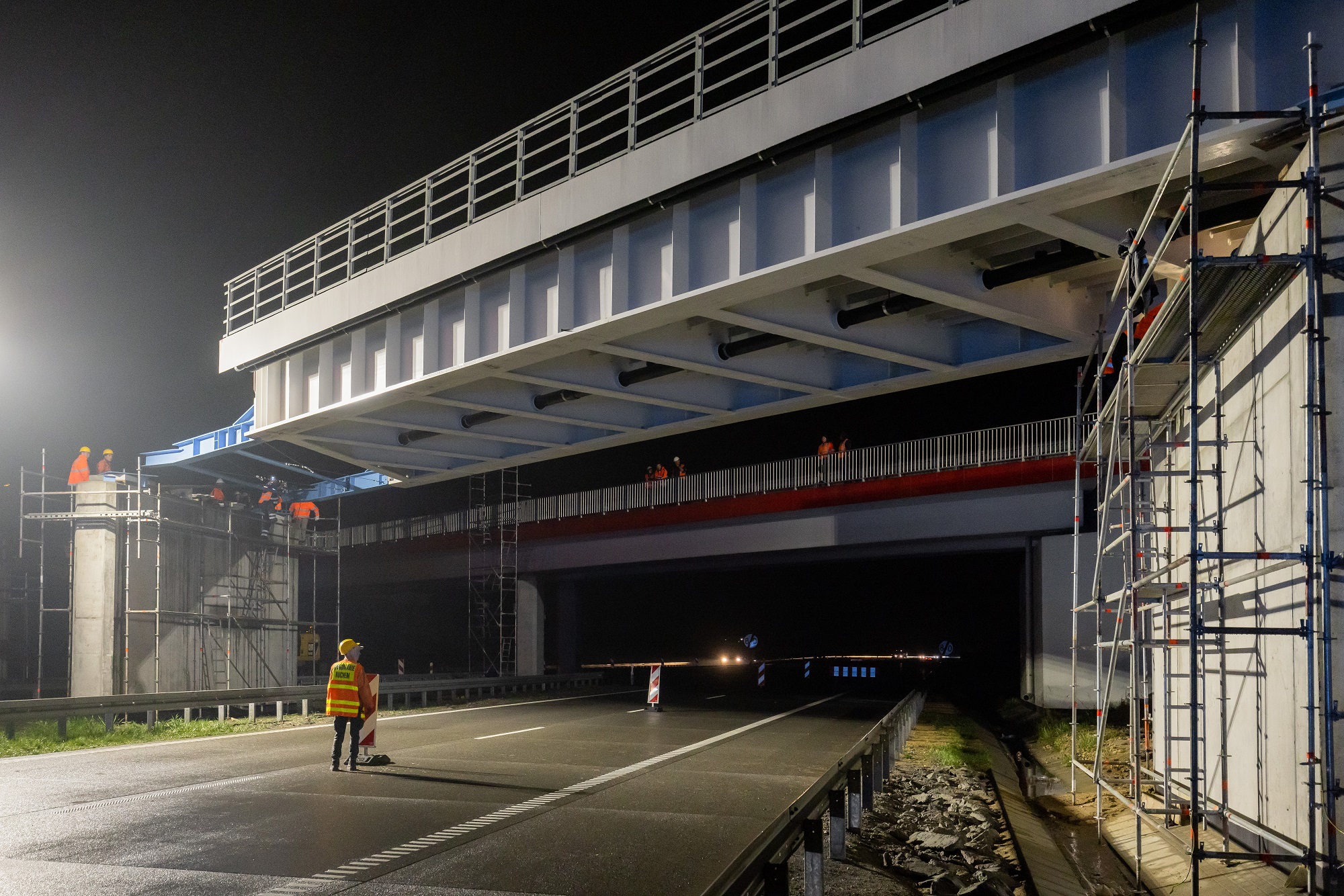 Jeśli przez kilka dni nie jechaliście autostradą A1 w woj. śląskim, możecie się zdziwić. Zobaczycie całkiem nowy wiadukt, który z dnia na dzień jest coraz dłuższy. Rośnie w nocy, bo właśnie wtedy nasuwane są kolejne przęsła. Prace trwały w nocy z 5 na 6 i z 6 na 7 maja 2022. Zobaczcie na pierwszym zdjęciu, jak to wyglądało w nocy z czwartku na piątek i czytajcie dalej, jak się montuje taki wiadukt.
