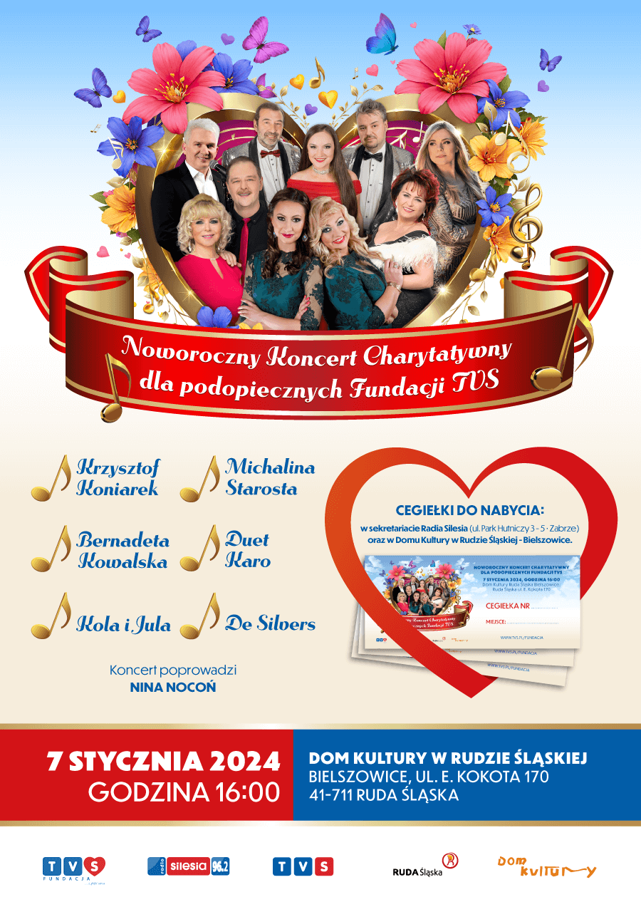 Od kilku lat Fundacja TVS przy współpracy z Telewizją TVS oraz Radiem Silesia organizują Noworoczny Koncert Charytatywny na rzecz podopiecznych Fundacji TVS. Wpisało się to w coroczne działania Fundacji TVS. Całkowity dochód z koncertu, czyli cegiełek, przeznaczony jest na działania statusowe Fundacji TVS.