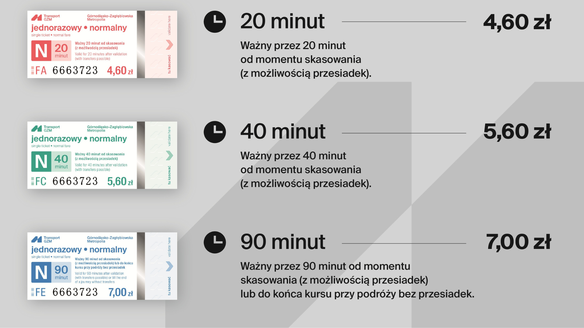 Już wkrótce w punktach sprzedaży pojawią się nowo zaprojektowane bilety jednorazowe uprawniające do podróży w sieci Transport GZM. Choć ich wygląd uległ zmianie, ceny i zasady korzystania pozostają bez zmian.