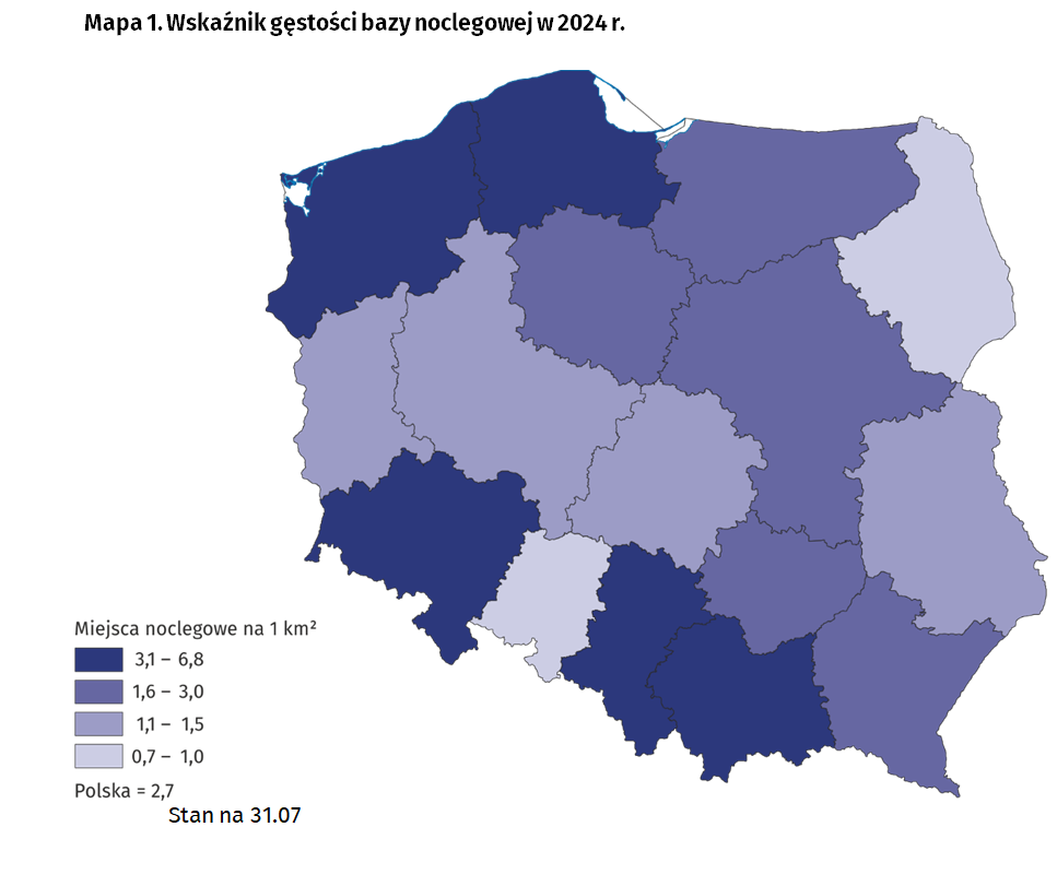 Największą bazą noclegową dysponuje województwo zachodniopomorskie to 153,7 tys. miejsc noclegowych. Na kolejnych miejscach plasuje się województwo pomorskie z 115,8 tys. miejsc noclegowych oraz województwo małopolskie z 103,5 tys. miejsc noclegowych.