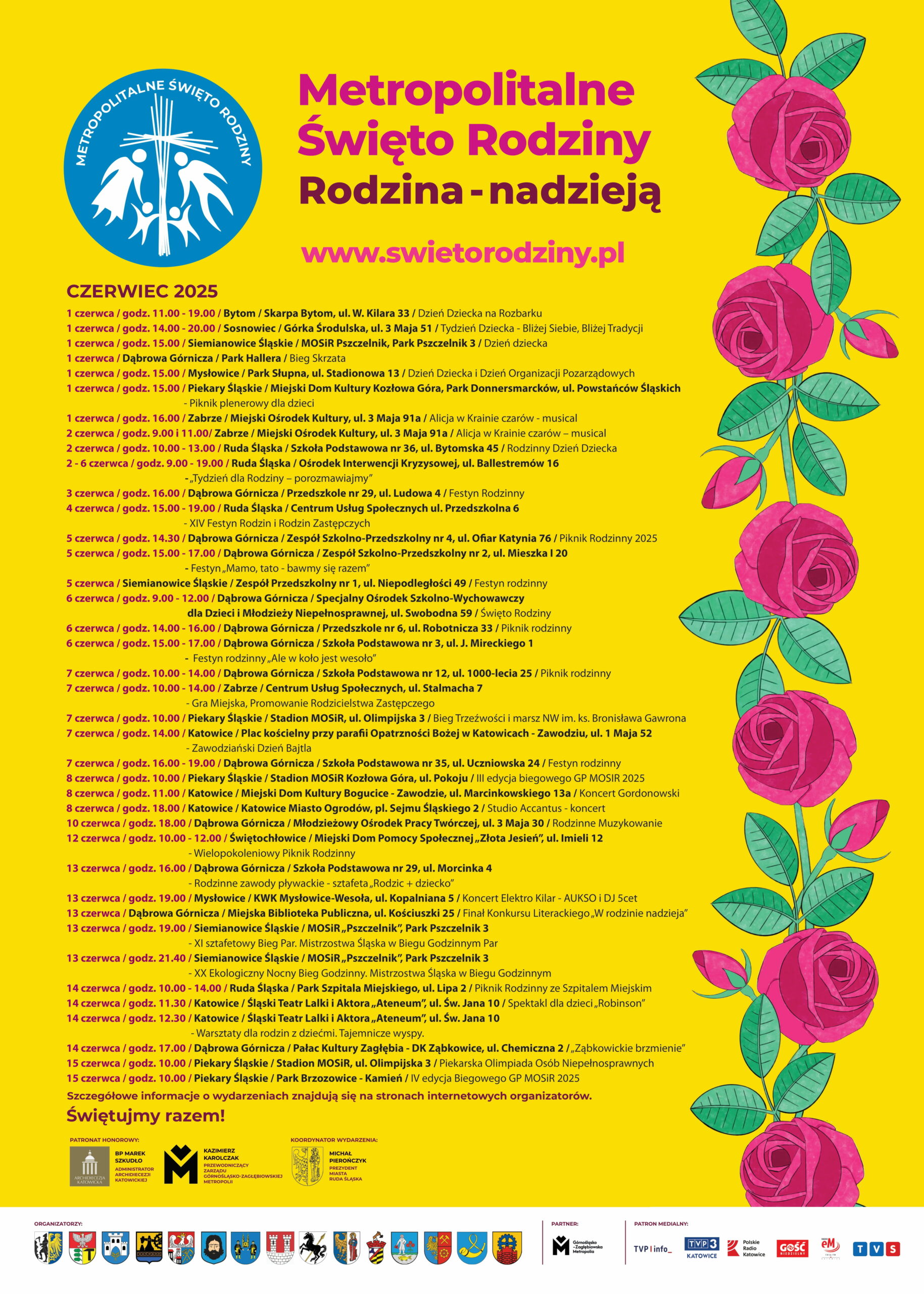 Metropolitalne Święto Rodziny 2025Tegoroczna edycja obchodzona będzie pod hasłem „Rodzina – nadzieją”, co nawiązuje do Roku Jubileuszowego ogłoszonego przez Papieża Franciszka oraz 100-lecia powstania Archidiecezji Katowickiej. Właśnie dlatego oprócz aktywności kulturalnych i edukacyjnych, nie zabraknie wydarzeń duchowych, takich jak Jubileusze Małżeńskie (18 maja w Katowicach) czy Pielgrzymka Mężczyzn i Młodzieńców do Piekar Śląskich (25 maja).