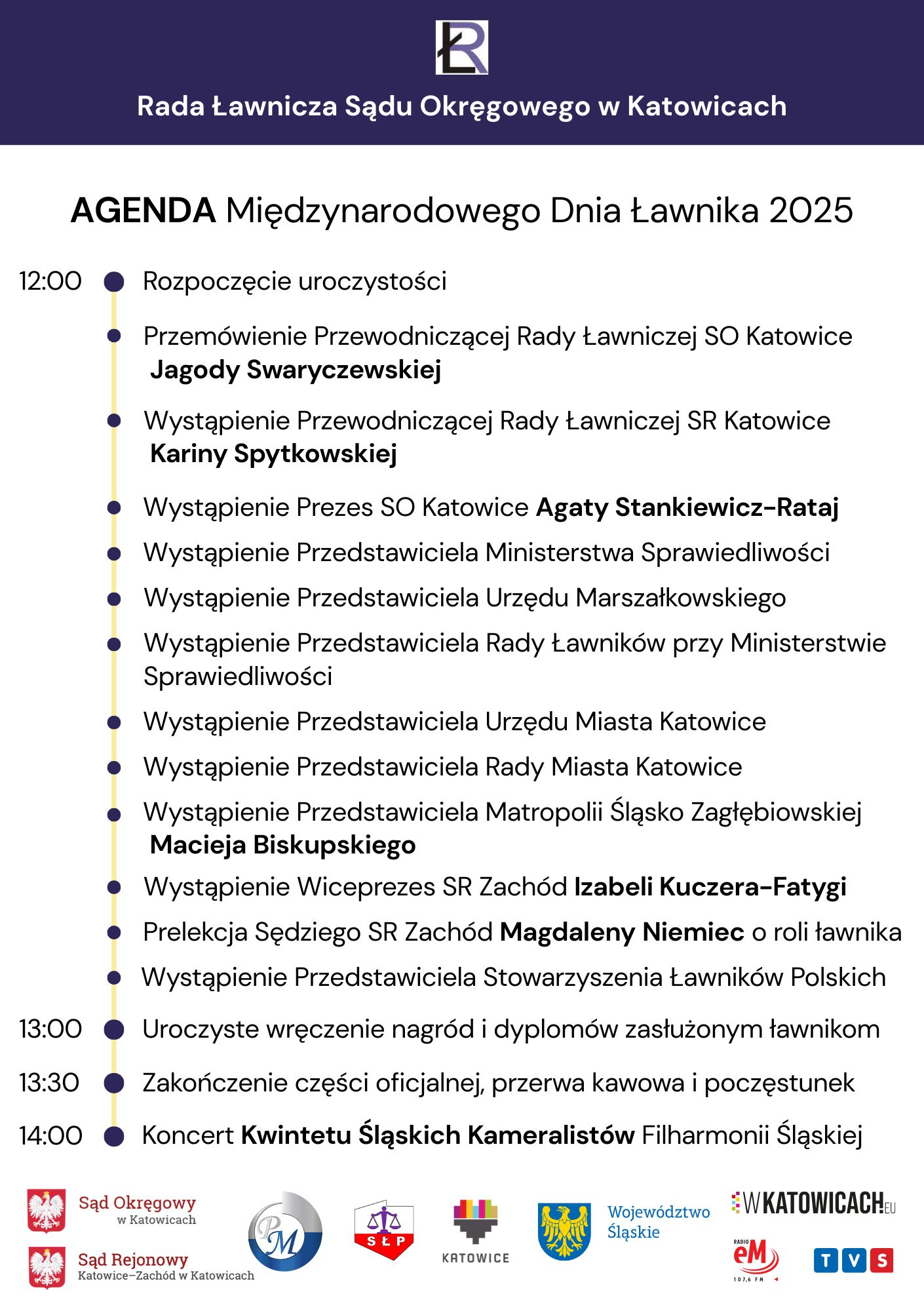 Głos podczas wydarzenia zabierze m.in. Przewodnicząca Rady Ławniczej przy Sądzie Okręgowym w Katowicach Pani Jagoda Swaryczewska, która w imieniu środowiska ławniczego przypomni, jak ważna, choć często niedostrzegana, jest rola ławnika.