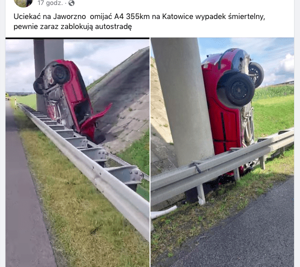 Na miejscu zdarzenia inny użytkownik drogi nakręcił filmi. Widać na nim auto wbite w filar. Jest na Facebooku na profilu Informace drogowe – Jaworzno i okolice.