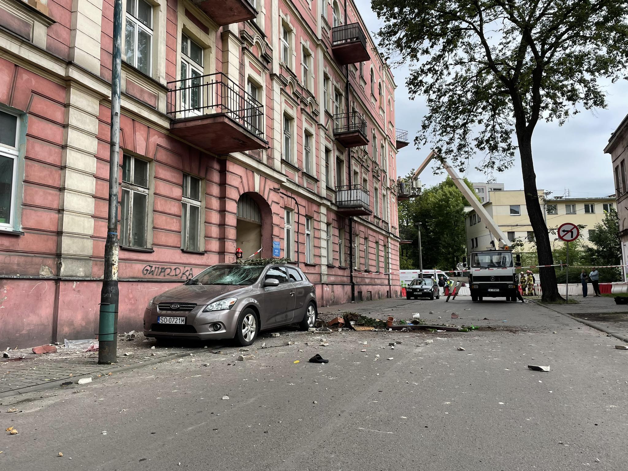 Na miejscu w dalszym ciągu pracują służby: policja i straż pożarna. Jak przekazał nam nasz reporter, Paweł Jędrusik, który jest na miejscu zdarzenia, balkon spadł na zaparkowany przed budynkiem samochód osobowy. – Obecnie zabezpieczane są lokale i jeden pustostan. Balkon uszkodził zaparkowany pod kamienicą samochód marki Kia – relacjonuje nasz reporter.