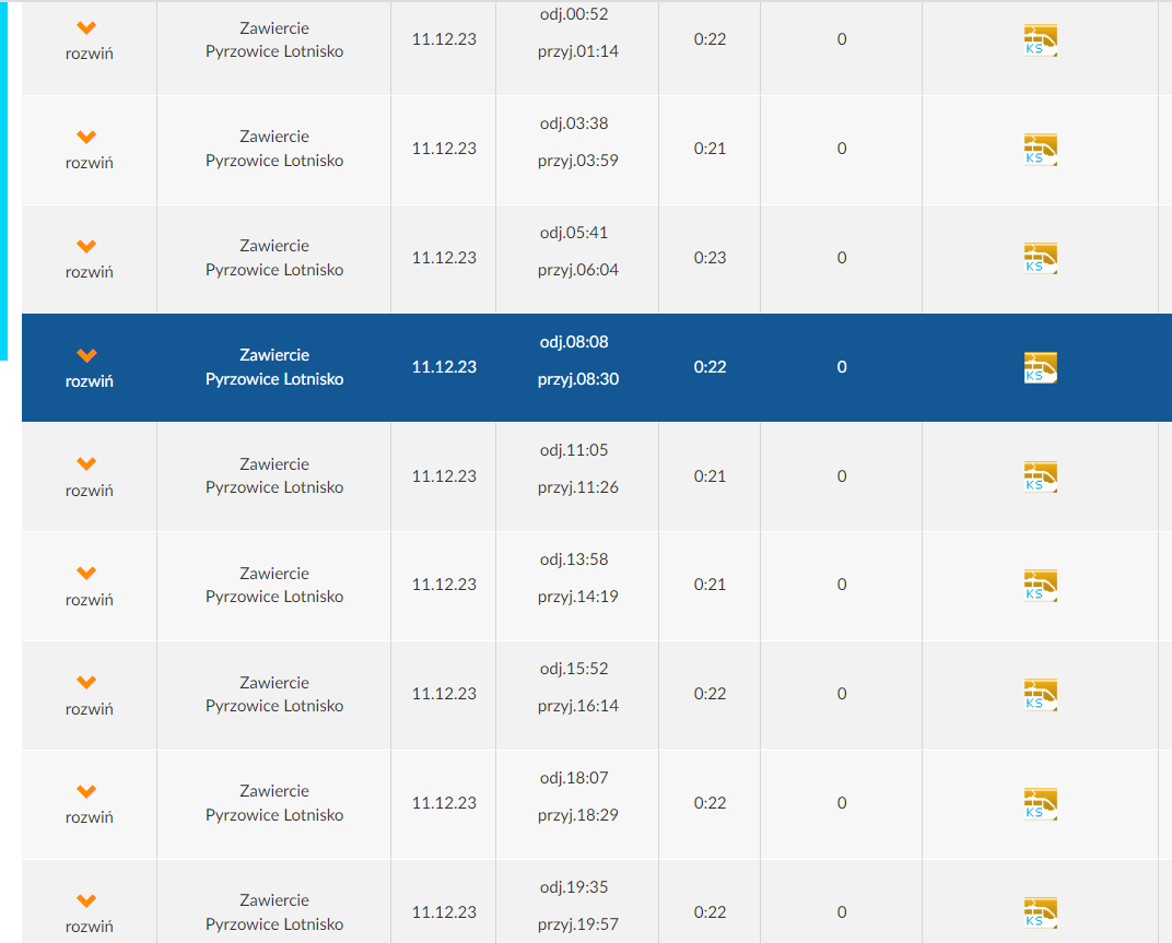 Pociągi jeżdżą mniej więcej co dwie godziny. W nocy są dwa, tuż przed godz. 1 i o 3.38. Ten pociąg będzie dogodny, by zdążyć na poranny szczyt w Pyrzowicach. Ostatni wieczorny kurs jest o godz. 21.56. Oto rozkład odjazdów z Zawiercia do Pyrzowic