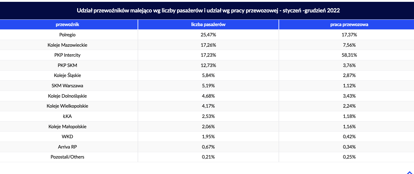 Wcale nie Intercity! Najwięcej pasażerów miał w 2022 Polregio – ponad 25 proc. wszystkich pasażerów kolei. Drugie są Koleje Mazowieckie, a dopiero trzecie – Intercity. Na czwartym miejscu są Koleje Śląskie, które miały nieco ponad 5-procentowy udział w rynku.