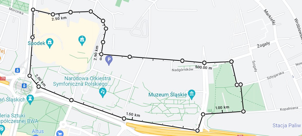 Te ponad 27 tys. miejsc parkingowych zajmuje w centrum Katowic 30 hetarów. Jak to sobie wyobrazić? To np. o wiele więcej, niż zajmuje Stadion Śląski (21 ha). Największe centrum handlowe w regionie, Silesia City Center, zajmuje działkę 212 tys. mkw. Czyli to tak, jakby na parking zabrać 1,5 SCC. A wszystkie trzy terminale pasażerskie na lotnisku w Pyrzowicach maja ok. 34 tys. mkw. To znaczy, że mogą pomieścić jedną dziesiątą parkingów i aut z centrum Katowic. Tylko z centrum. A jeśli chcielibyście wszystkie te miejsca parkingowe ułożyć w strefie kultury, to zajęły by ją całą, i jeszcze brakło by powierzchni i trzeba zabrać na parking jeszcze kawałek Parku Boguckiego. Spójrzcie, takie wyliczenia można zrobić, korzystając z map Google. W zaznaczonym obszarze jest ok. 330 tys. mkw terenu.