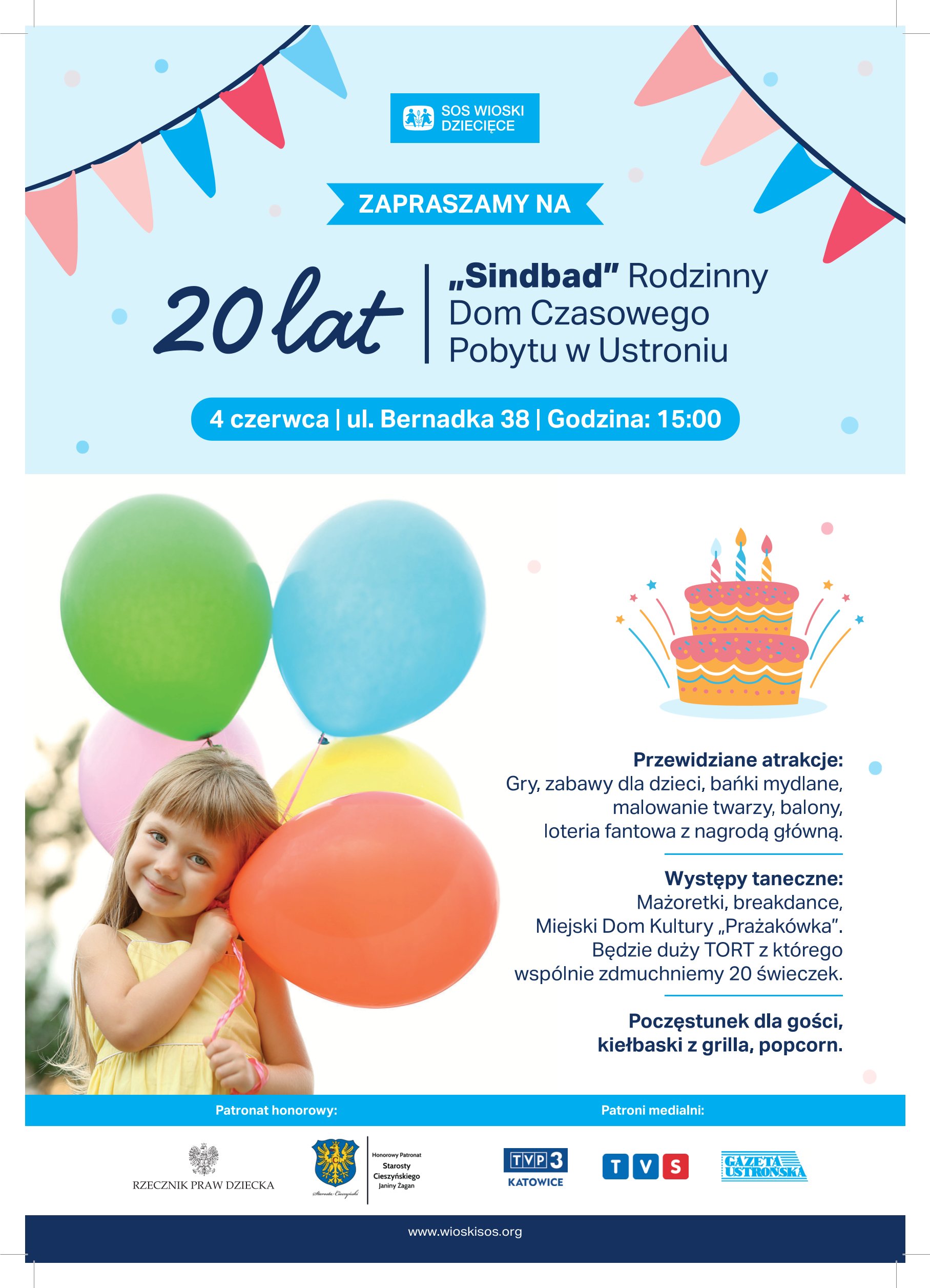Wspólne świętowanie już 4 czerwca! Urodzinowy piknik odbędzie się na terenie „Sindbada”, przy ul. Bernardka 38 w Ustroniu! Start o godz. 15:00, a na miejscu mnóstwo atrakcji dla dzieci i rodzin.