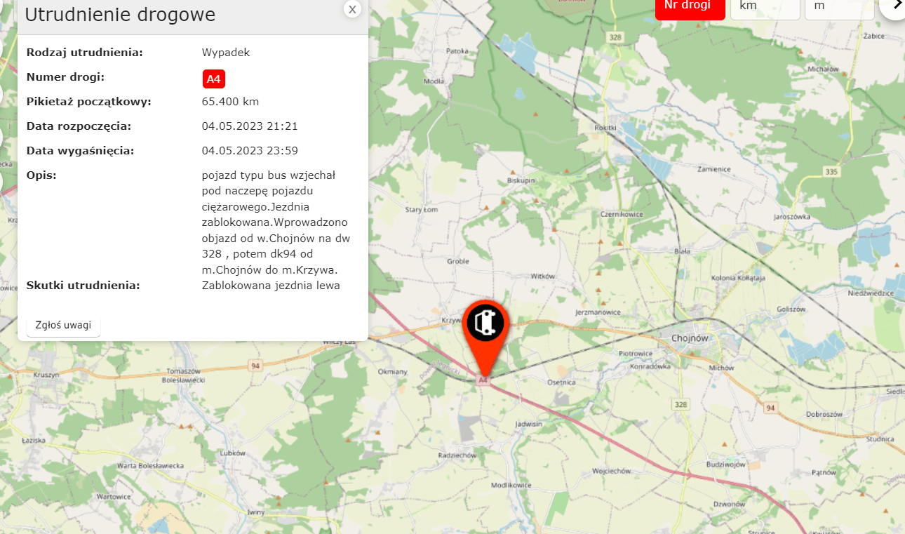GDDKiA tak opisuje to zdarzenie: pojazd typu bus wjechał pod naczepę pojazdu ciężarowego. Jezdnia zablokowana. Wprowadzono objazd od węzła Chojnów na DW 328 , potem DK 94 od miasta Chojnów do miasta Krzywa. Skutki utrudnienia: Zablokowana jezdnia lewa.